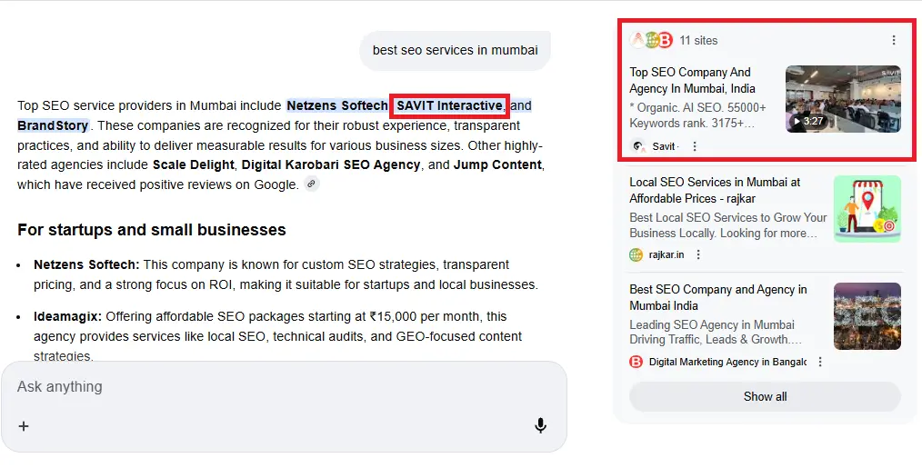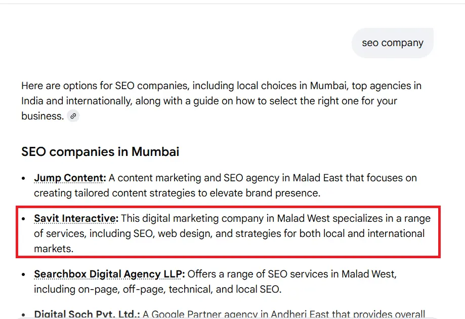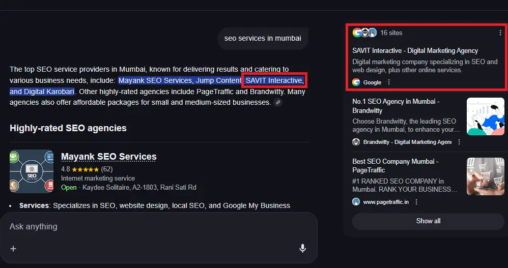 The AI Overview may highlight agencies, examples, or service recommendations drawn from local signals such as business profiles, reviews, and regional relevance.