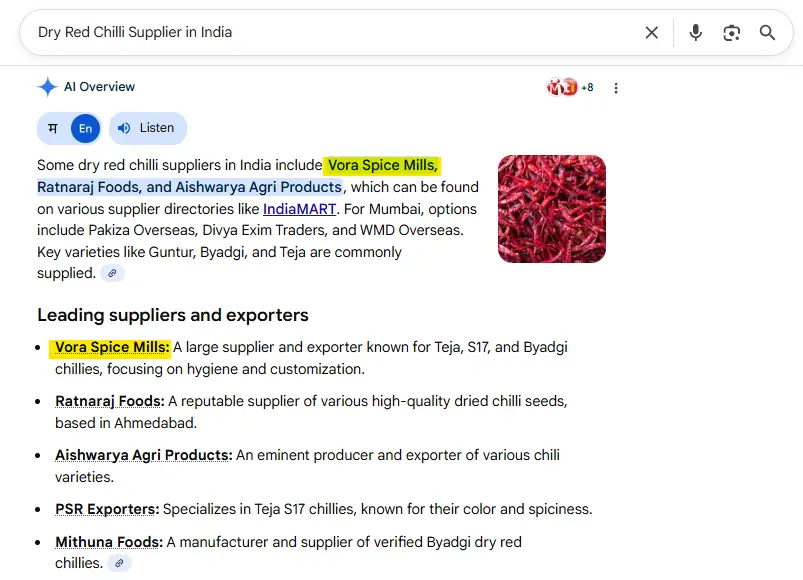 Example: A search for “Dry Red Chilli Supplier in India” in AI Mode may show a summary citing Vora Spices blog.